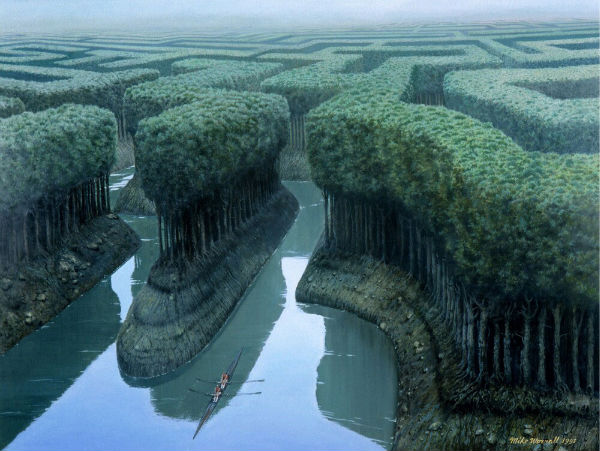 So the party is making its way along a stream or canal and comes across this maze. The interesting thing here, I think, is not so much the challenge of navigating through it, but the mystery of why it was put there in the first place.