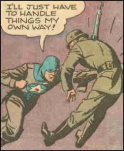 Daniel Lyons was another lucky guy who almost died near a reclusive scientist’s laboratory. Nursed back to health by the scientist, Daniel discovers he now has super powers, and decides to use them to fight the Axis. You have to have chutzpah to show up on a battlefield dressed like this guy.