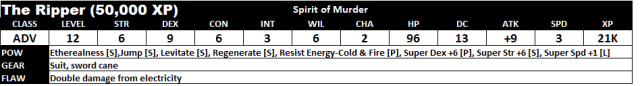 4. Likewise, it’s a good idea for everyone in the group to have at least one super ability score. Failed intelligence feats to make connections and find clues and failed charisma feats to acquire items and shake down thugs made it obvious that super abilities are highly useful. This was only highlighted when the super villains, built with 40,000 XP each to give them a fighting chance against the more numerous heroes, came in with more levels. Honestly, the Clown build was sub-optimal as well – his swords were pretty pathetic, while the Brute’s iron claws almost took out Nightmare.