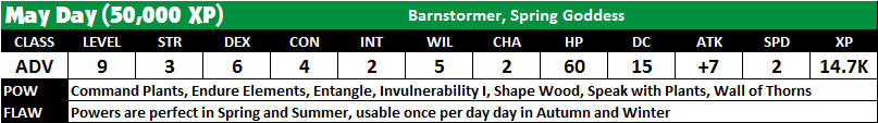 Bess now found herself transformed – able to speak to plants and command them. Communicating with the plants of the swamp, she discovered the whereabouts of the racketeers and thwarted their smuggling operation. Although the days of barnstorming are over, Bess still works as a pilot in her normal life, and as the super heroine May Day when evil rears its ugly head.
