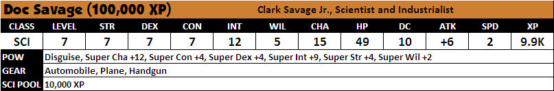 From Wikipedia – “Doc Savage’s real name was Clark Savage, Jr. He was a physician, surgeon, scientist, adventurer, inventor, explorer, researcher, and, as revealed in The Polar Treasure, a musician. A team of scientists assembled by his father deliberately trained his mind and body to near-superhuman abilities almost from birth, giving him great strength and endurance, a photographic memory, a mastery of the martial arts, and vast knowledge of the sciences. Doc is also a master of disguise and an excellent imitator of voices. “He rights wrongs and punishes evildoers.” Dent described the hero as a mix of Sherlock Holmes’ deductive abilities, Tarzan’s outstanding physical abilities, Craig Kennedy’s scientific education, and Abraham Lincoln’s goodness. Dent described Doc Savage as manifesting “Christliness.” Doc’s character and world-view is displayed in his oath, which goes as follows:[1]