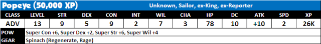 From Wikipedia – “In most appearances (except during the World War II era), Popeye is a middle-aged sailor with a unique way of speaking, disproportionately muscular forearms with two anchor tattoos, thinning hair, and an ever-present corncob pipe (which he toots like a steamship’s whistle at times). Popeye is generally depicted as having only one eye, his left. In at least one Fleischer cartoon, Bluto refers to Popeye as a “one-eyed runt.” Mostly quiet as to how he lost his right eye, the sailor claims it was in “the mos’ arful battle” of his life with Sea Hag’s vulture. Later versions of the character had both eyes, with one of them merely being squinty, or “squinky” as he put it. According to the official site, Popeye is 34 years old and was born in a typhoon off Santa Monica, California. However, in Popeye, the Ace of Space, his original age is given as 40 by an alien aging machine. In 1934, Segar stated that Popeye was born in Victoria, Texas.