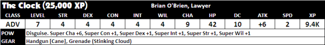From Wikipedia – “His secret identity is that of Brian O’Brien, a wealthy member of high society and a former lawyer. He had a secret, underground and was a hypnotist. His minimalist costume was a three-piece suit and a mask and he was a master of disguise. He had clever gadgets (such as a cane whose head becomes a projectile and a diamond stud that fires teargas) and he usually left behind a calling card bearing the image of a clock-face and the words “The Clock Has Struck.””