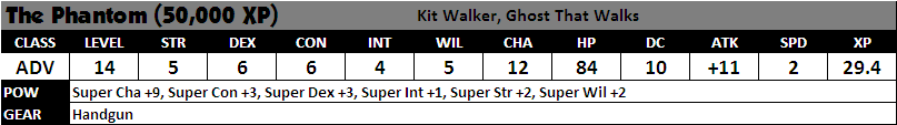 The Phantom of the present is the 21st in the line. Unlike most costumed heroes, he has no superhuman powers, relying only on his wits, physical strength, skill with his weapons, and fearsome reputation to fight crime. His real name is Kit Walker. References to “Mr. Walker” are in the strip often accompanied by a footnote saying “For ‘The Ghost Who Walks'”, although some versions of the Phantom’s history suggest that Walker was actually the original surname of the man who became the first Phantom.