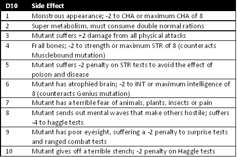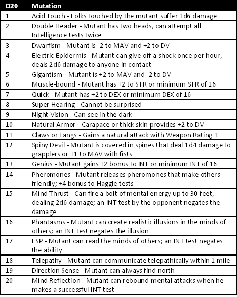 About 99% finished with my Mutant Truckers article for NOD 12. Thought I’d share the mutation tables to give folks an idea about just how mutant-y the game is. In general, Polyester Road doesn’t go as far down the mutant path as Gamma World and Mutant Future. Because it’s a mini-game/setting, I wanted to keep it focused and keep it from being too long. So, there is a small table of mutations – physical and mental, for folks to roll on. Characters can trade one hit dice for one mutation. Each mutation carries with it a 1 in 6 chance of a negative side effect (radioactive scrambled DNA can be dangerous, you know). Referees can use the same process to mutate monsters, bandits and bears (i.e. county mounties) – trade a hit dice for a random mutation. Hopefully, this will keep the mutations from dominating the game, but still allow for some fun variation of the characters.