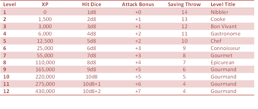 Prime Requisite: Constitution, +5% bonus to earned XP if 13+. A gourmand needs a strong stomach to tread where their palette takes them.