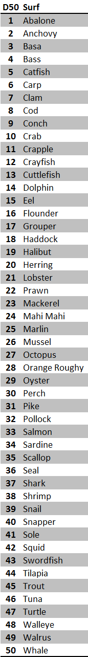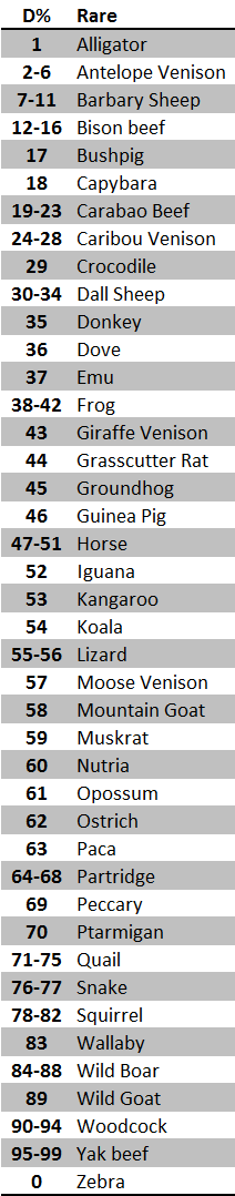 The true origin of these tables was in a document I use while stocking my random hex crawls. I call it “The Thesaurus”, and it began as just that – a thesaurus of color words so I didn’t have describe everything red as “red”. It soon expanded to land forms, people and then food and clothing. There are just too many excellent words out there not to attempt to use them all, you know. Having this little storehouse of knowledge, I came up with this as a way to present at least the edible part of it. You can use these tables to concoct strange fantasy recipes (either to serve players as guests, or to send players after on kingly quests) or just use them when trying to stock your own world’s and dungeons.