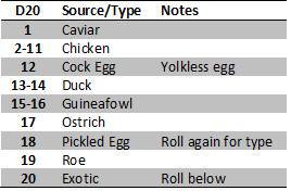 When the emperor sits down at his table, surrounded by the assembled kings, nobles and merchant princes of his domain, his servants do not serve dishes assembled for their succulence, but rather for their expense. In the world of emperors and kings, one entertains to show his guests just where they stand in relation to the throne – i.e. beneath it. Of course, the table setting is part of the overall effect – plates and utensils of porcelain, silver and gold – but the dishes, composed of rare and wondrous ingredients is just as important if not more so. Thus – the patented Nodian Random Haute Cuisine Generator. With a mere handful of dice, you can cover the tables of nobles, kings and emperor’s alike with meals fit for a gourmet (or gourmand).