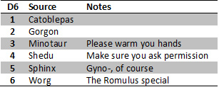 When the emperor sits down at his table, surrounded by the assembled kings, nobles and merchant princes of his domain, his servants do not serve dishes assembled for their succulence, but rather for their expense. In the world of emperors and kings, one entertains to show his guests just where they stand in relation to the throne – i.e. beneath it. Of course, the table setting is part of the overall effect – plates and utensils of porcelain, silver and gold – but the dishes, composed of rare and wondrous ingredients is just as important if not more so. Thus – the patented Nodian Random Haute Cuisine Generator. With a mere handful of dice, you can cover the tables of nobles, kings and emperor’s alike with meals fit for a gourmet (or gourmand).