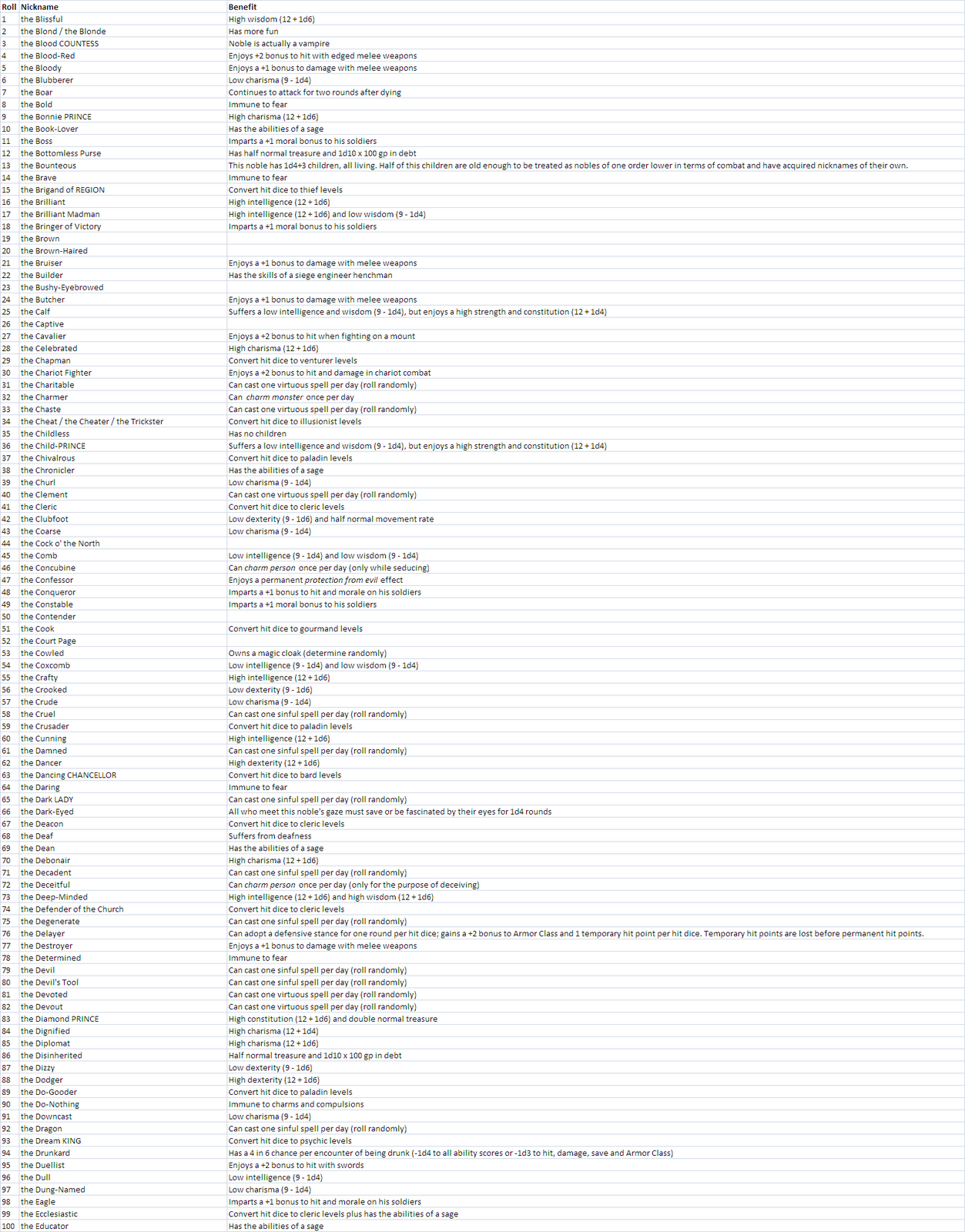 Here’s another thought regarding the relative power of nobles. The thinking behind makings kings weaker than border barons is generally sound in terms of “earned experience”, which drives the player characters. On the other hand, not all kings are lay-about weenies. Frederick Barbarossa (you can access a scholarly review of his life HERE) and Henry V come to mind, as do Genghis Khan, Julius Caesar, etc. These are the architects of empire, as opposed to the heirs of empire. So – if you’re doing your king or duke or count as an architect of a great kingdom or empire, by all means, use the Borderer stats for him or her.