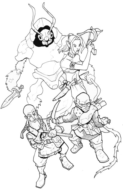 I’m not only working on the second half of the “outer hells” hex crawl for NOD 12, I’m also working on part two of the “Deep Denizens” article. The first part had rules for four humanoid races as PC races – orcs, hobgoblins, bugbears and kobolds. The second part features the drow, duergar, svirfneblin (okay, they’re not dark) and the notac-ichat, an insectoid race I made up for the hex crawl. Here is the depiction of these folk by the great Jon Kaufman (pachycrocuta at DeviantArt).