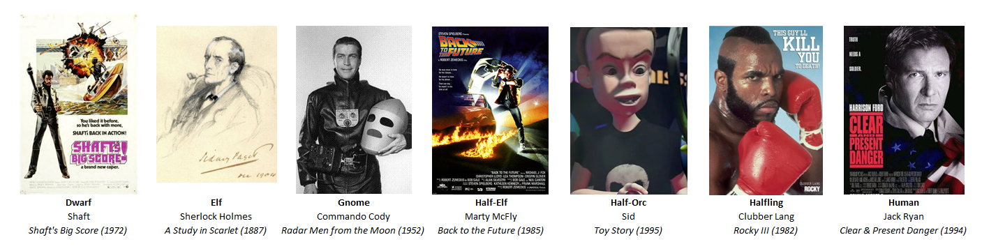 Let’s take some average adventurers from the “core” races as starting adventurers and treat each of them as an action/adventure hero from a movie or book published in the year they were “born”, using 2012 as our current year.