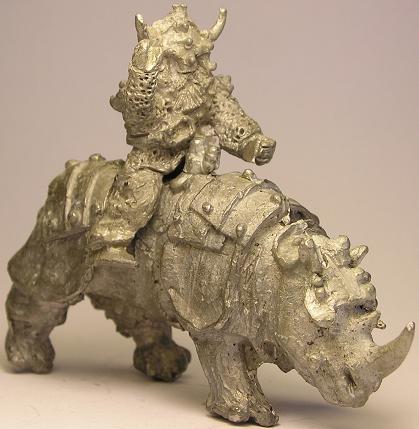 The next page shows off several miniatures, including Rhino Riders from Dragontooth Miniatures. I’ve admitted before that I’m a sucker for fantasy characters riding on inappropriate mounts, so this one is right up my alley. I found a picture online …