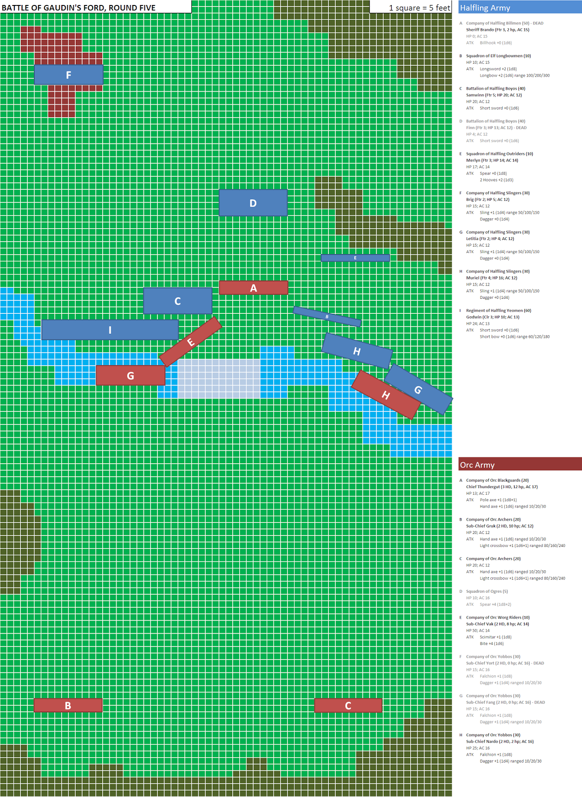 Orc B and C are not going to reload this round, but rather hustle towards the lines. The orc chief needs orcs on the line to hold the bank and claim victory. Orc E and H are going to continue to attack, and Orc A is going to wheel and hit Halfling C in its flank. Clearly, initiative will be important this round.