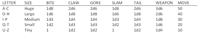 Now we need to generate some basic stats for our monster. We’re going to use the noun to determine the monster type (even if you don’t use type in your system, this is still good for figuring out what the monster looks like and how it attacks), size (important – determines speed and damage), hit dice and armor class.