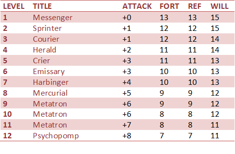 First level runners (messengers) are known for their quickness and their utility as messengers. They gain Armor Class bonuses as monks (same progression) and can make Will saves (modified by intelligence) to understand unknown languages and Will saves (modified by their charisma) to make themselves understood to those who do not speak the same language.