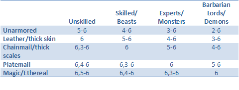 Of course, less skilled fighters use different hit scores. The full attack matrix is there to the right.