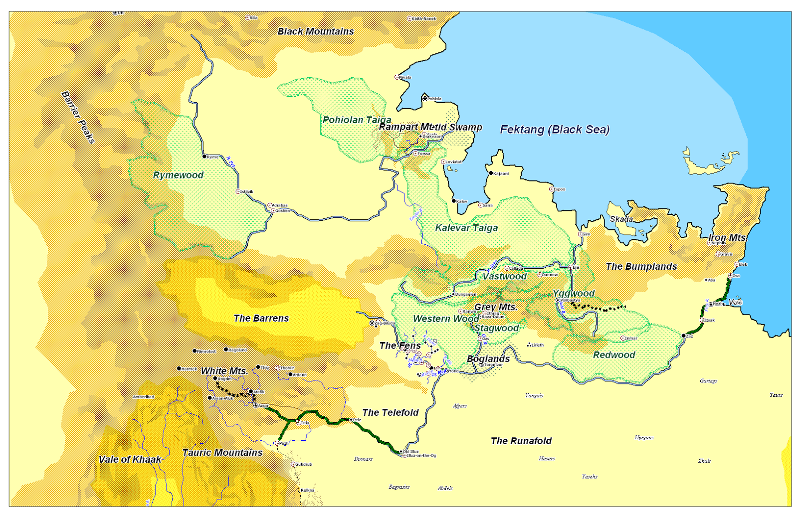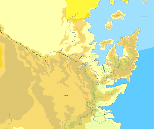 The advantage was that MapInfo maps are fully geocoded – i.e. they have real lat/long coordinates. For Nod, I began with a map of North America and then drew my continents (based on a projection of Earth many millions of years into the future) on top of it. From there, I slowly sculpted the shorelines, drew in woodlands, hills, mountains, deserts, etc.