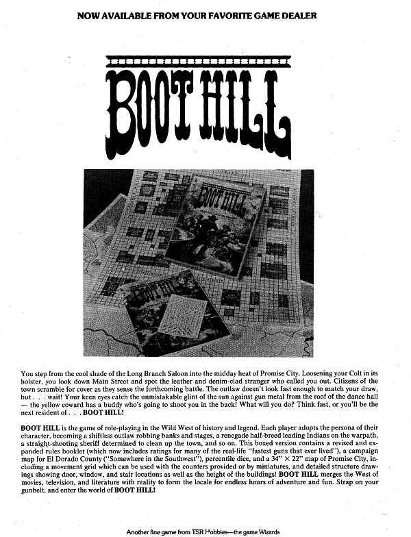 Next up is an ad for Boot Hill, a game I know little about but would love to explore. I’ve been hankering to do a sort of Old West Bloody Basic, but I’m waiting until Grit & Vigor is finished so I can base it on those rules.