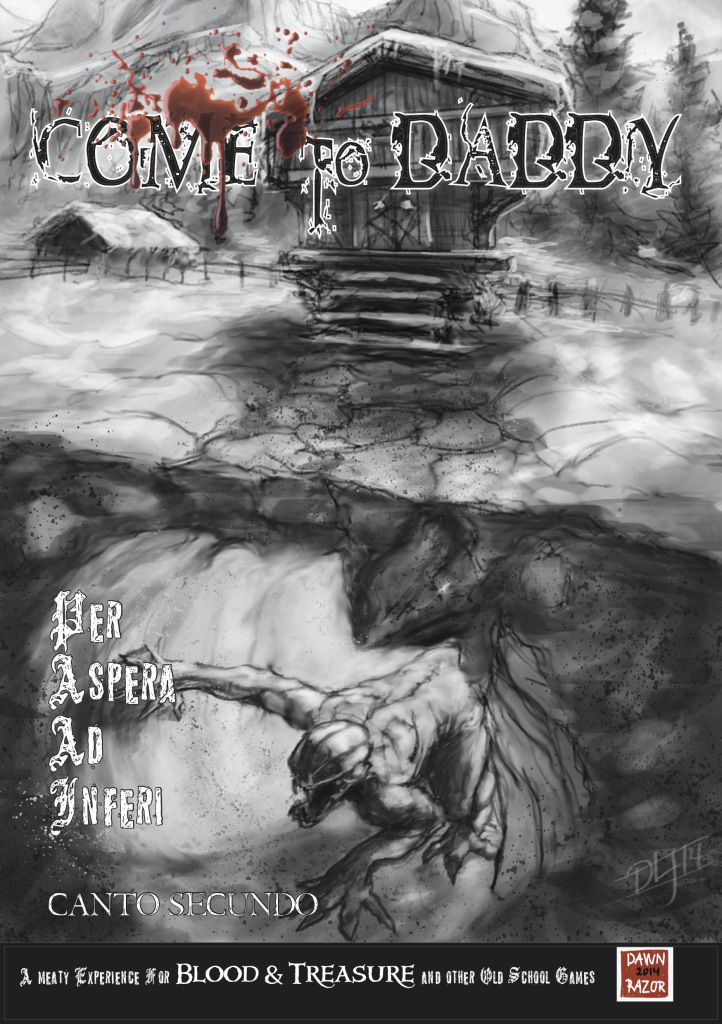 Besides the adventure, you also have many extras – The Ritual of Banishment – a form of ritual magic used to defeat the Mother of Lies; a few monsters, many unique (such as the aforementioned Mother of Lies, a were-worg, “the severed ones” and multiple ghösts) and rules for horror and madness (with some great random tables), some new traps, new magic items and spells, alternative healing rules, and rules that expand the poison (and drugs) in Blood & Treasure very nicely. Honestly, if you play B&T or just like it, you’ll get plenty from Come to Daddy even if you never play the adventure.