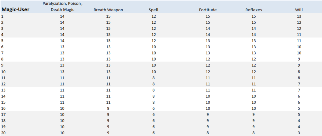 Magic-users are pretty close on PPDM vs. FORT and BW vs. REF. SP/WILL differ somewhat, with a marked improvement in 3E at very high levels.