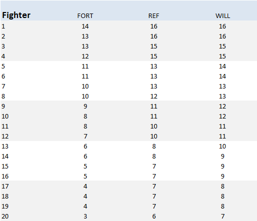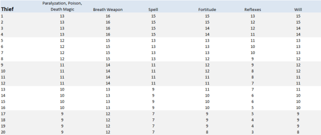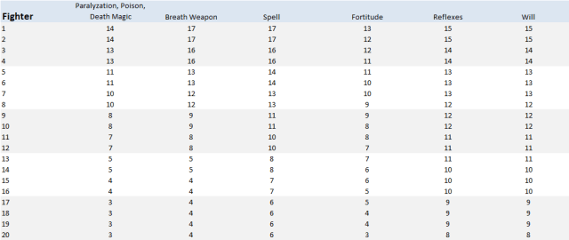 So, between those editions, there were changes to be sure, but the overall ranges from 15 to 8 for poor saving throws and 13 to 3 for good saving throws, are pretty close.