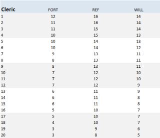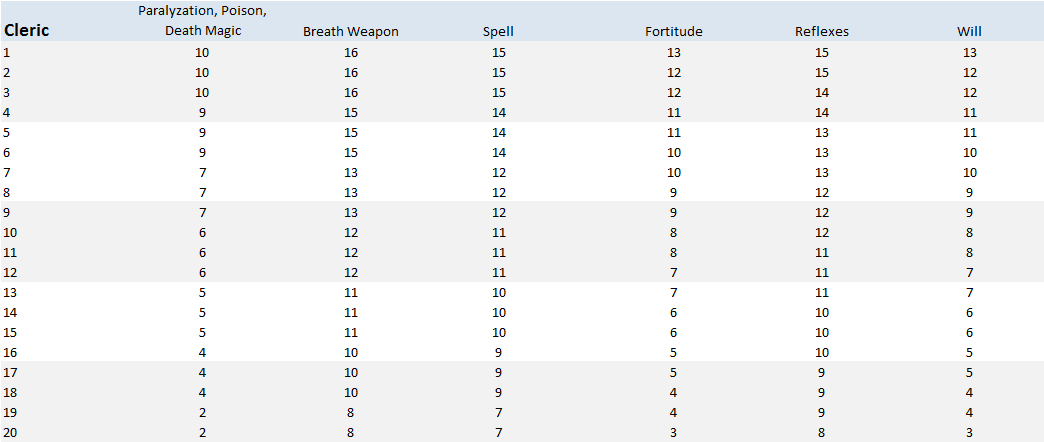 Clerics (or Priests, in 2E) weren’t that great against spells, which was changed in 3E. People often complained about the clerics being a bit too good in 3E, so perhaps they shouldn’t have made that change. That aside, the other categories end up pretty close at 20th level, but PPDM is much better than FORT for most of the cleric’s career. Perhaps the worse FORT save in 3E makes up for the better WILL save.