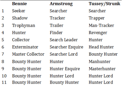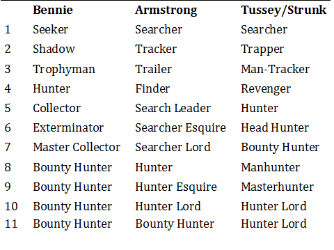 Up next are three – count ’em three – takes on the bounty hunter class by Scott Bennie, Tom Armstrong, and Robert L Tussey and Kenneth Strunk. Lets judge them by the most relevant part of the class – the class titles!