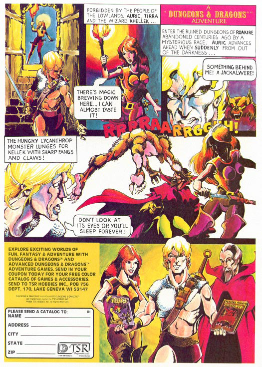This involves the adventurers Auric, Tirra and the wizard Khellek (who does not appear to be this guy – scroll down a bit). Auric is an ill-armored fighter, Tirra could be a thief or fighter and Khellek is a wizard. They tangle briefly with a jackalwere and then … to be continued.