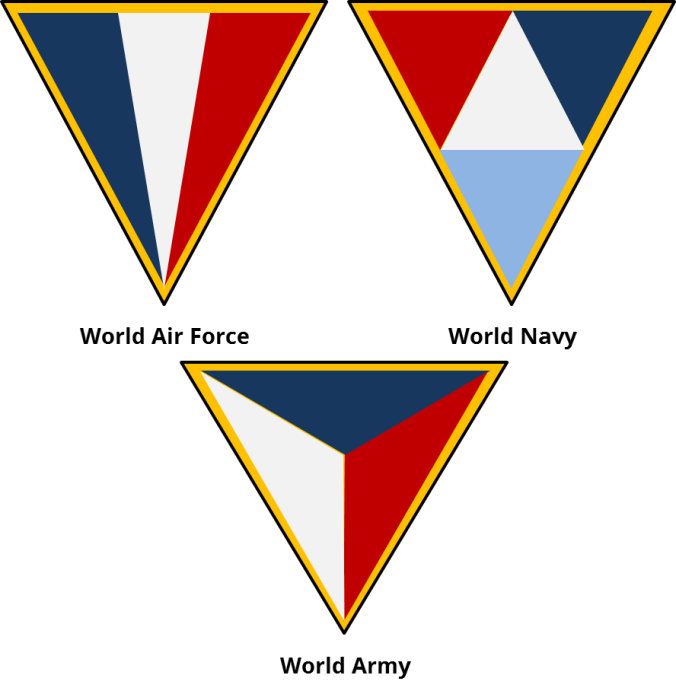 While some of the series reference the U.S. military and British military, they also reference world-wide military organizations – the World Army, World Air Force and World Navy. They have some pretty groovy emblems:
