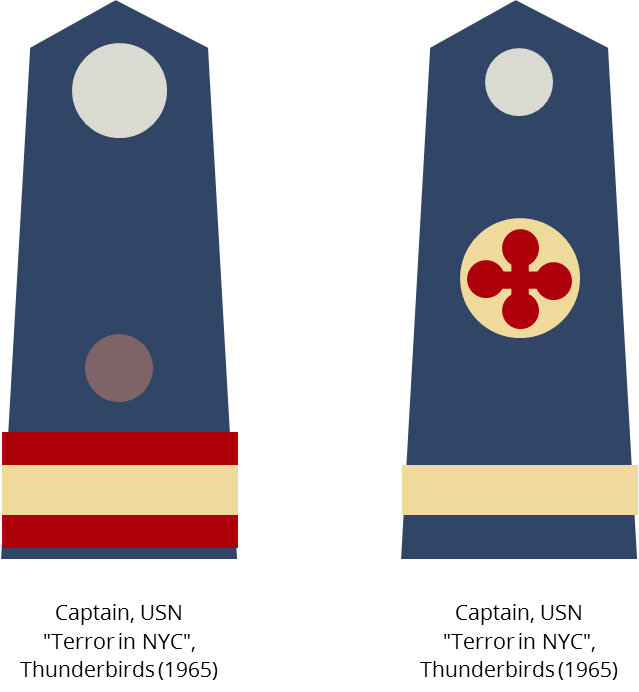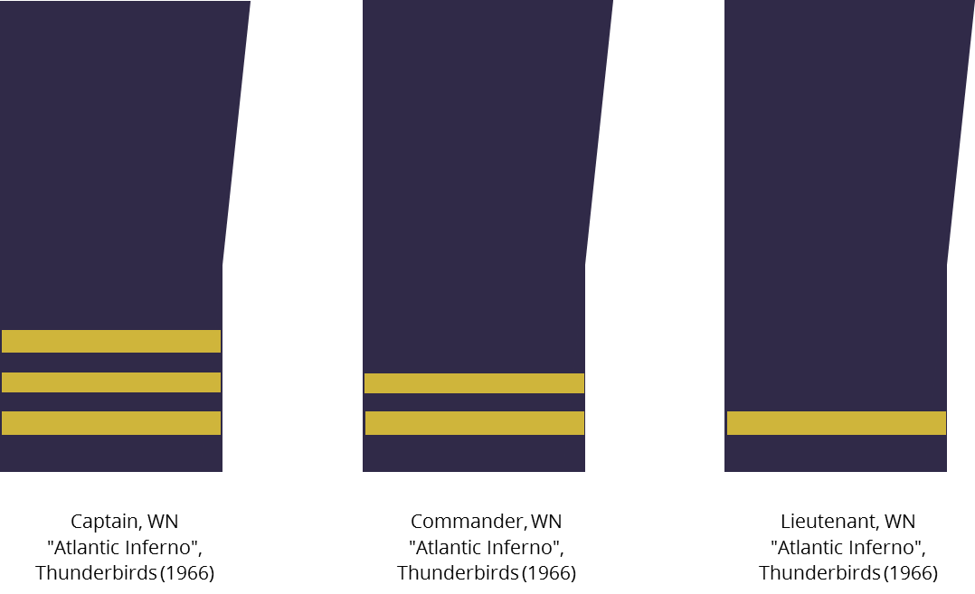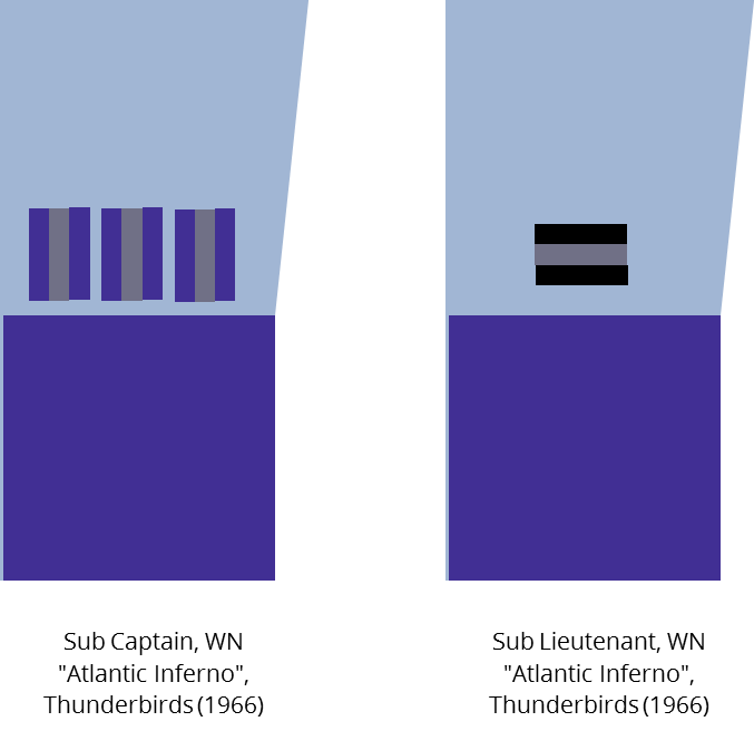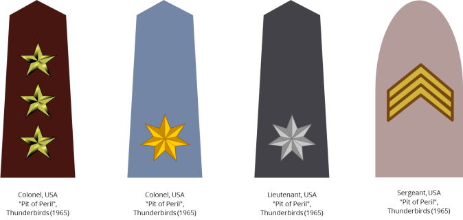 Where uniforms are concerned, they can jump all over the place. At some point I’m going to diagram them, because they are super cool, but for now, I’ve diagramed some of the rank insignia. It’s often hard to figure out just what they look like, since the marionettes are fairly small. It’s also hard to figure out the overall schema sometimes. But here’s what I’ve figured out so far …