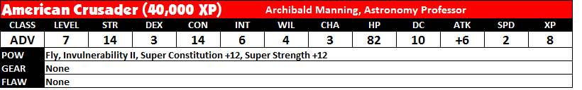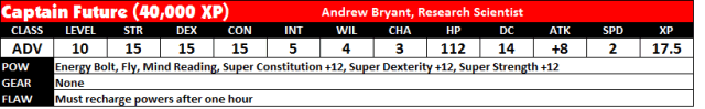 There was one other hero – Random by Crystal Franklin – whose character sheet went home with Crystal. I can report that he was a drag queen based loosely on Gambit who could fly and shoot energy bolts.