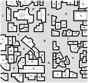 4. Tapestry Weaver: Alulla’s work hangs in the palaces and temples of Ophir and other city-states. An elderly woman with a small, wrinkled face, long silver hair and a hunched back, Alulla is well read in history and mythology and has a 1 in 6 chance of answering obscure questions on these subjects. Her building is two stories tall and built of dark grey stone with a flat roof. The arched windows on her second floor are covered from within by tapestries, and two fine tapestries for sale (100 gp each) hang outside during the daytime. Alulla owns a pair of intelligent, talking ferrets (Zim and Yip) who keep her up-to-date on the goings on of the city-state. Alulla’s home is simple and neat. She keeps her loom near the window and her treasure (135 gp) under the floor boards. Most of her earnings go to the Temple of Shedu [56]. Alulla has a long-standing loathing of Hogo [8], whose family stole her father’s fortune and may have murdered him long ago.
