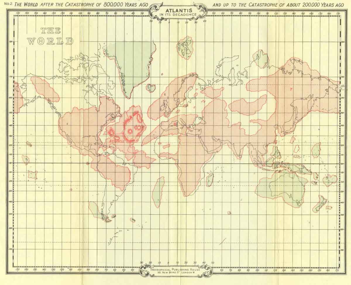 The theosophists believed (okay, made up – sorry, I’m a science guy, so I don’t jibe well with the realms of pseudo-history, pseudo-anthropology and pseudo-science) in the concept of root races – races of “humanity” that preceded modern human beings. These races were supposed to be our forebears, and indeed shared the planet with us. In these elder days long forgotten, planet Earth was very different than the Earth we know today, geographically-speaking. The theosophists were working off of some theories popular at the time that have since been abandoned, specifically the notion that continents could sink into and be raised from the ocean depths. Understanding continental drift as we now do, we know that Earth’s continents were configured differently back in the day, but we also know that this was not due to continents sinking or rising from the ocean floor.