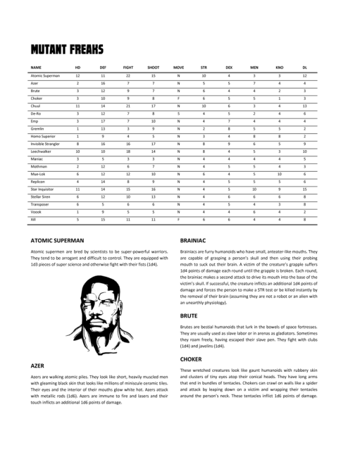 For monsters, I tried to hit the highlights of sci-fi. Space brothers from UFOlogy rub shoulders with the ro-man from Robot Monster and martians from Santa Claus Conquers the Martians. The olvugai from Pars Fortuna made it into the game – I love sticking things from one of my games into others, to keep them all in the same “universe” – as did H.G. Well’s martians as zarks, the vulcans and klingons as red and blue voltans and the vampire from TV’s Buck Rogers made it in as the space vampire. I stuck girallons in the game because they were inspired by the white apes of Burrough’s Mars, and flail snails because I love flail snails. The point was to mix and match all sorts of nonsense to build gonzo space fortresses (i.e. dungeons), and that was what I did. I also included a way to build random (or non-random) alien animals.