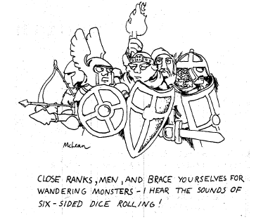 “Snap! Crackle! Zap! THE DRAGON computes! Recently, we’ve acquired a TRS-80 computer here at THE DRAGON (for those of you into home computers, it’s the Level II with 16K memory, a 16K expansion interface, two floppy-disc drives, and a printer). In addition to using it in conjunction with Mark Herro’s ‘Electric Eye’ column, we’ll now be able to look at a few of the plethora of game programs now available on the commercial market, and (hopefully) do some reviewing on our own. Please hold off on sending us your own home-brew programs for a bit yet; we’ll have our hands full with what’s on the market already. But electronic gaming is looming on the gaming horizon, and THE DRAGON is going to be ready for it.”