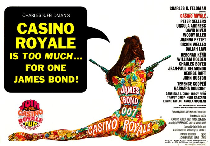 In 1967 we make our second detour from “canon” with Casino Royale, a weird little parody of the series starring Peter Sellers, Woody Allen and, as the real James Bond (I think – it’s an odd film), David Niven. Had the Bond film franchise started in the 1950’s, Niven may well have played the roll. The movie didn’t do much for me, though I always appreciate Niven, and it had both an awesome movie poster by Robert McGinnis and a great theme song.