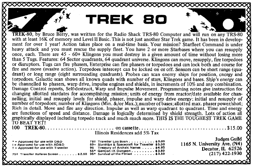 Looks like Judge’s Guild got into computer games early. The only thing I can’t figure is whether or not this was a licensed game. Here’s the article on the game at Wikipedia … and here, apparently, is a clone …