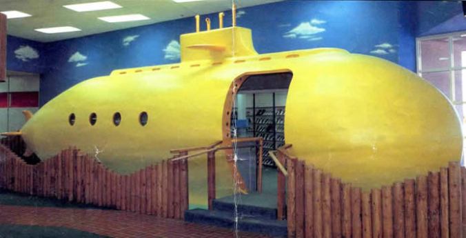 Watching the movies on VHS is partly nostagia, since I grew up not only watching those things, but working in the World’s Largest Video Store (and meeting my future wife there). The picture below is of the music video section at my store, the Video Park – it was a rereation of the Beetle’s Yellow Submarine. We had a real haunted house for the horror movies, a circus tent for the kid’s movies, and a brothel for the adult films. We also had some really awesome bosses in Dale & Lisa Clark and Harold Vosko. I notice that in the left-hand corner of the picture below you can just see a bit of the sports section, which looked like the Thomas & Mack center. God, I miss that job!