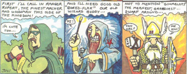 A classic of old Dragon (hell, a classic of modern articles as well, in as much as it addresses the idea of “balance” between characters). Ronald includes a few ideas of controlling these damn wizards so they don’t mess up the game. Interesting, because it introduces the idea of forced fairness to the game – i.e. I want the game to go one way, but the rules aren’t allowing that to happen. Think of the article previous – the explorer explores a lost city and you roll a dice and that determines what happens – amazing wealth or complete insanity. That’s it. Why? It’s a game, and those are the rules, and playing the game is more important than winning. Or, to state it another way, winning or losing should be a product of the game experience, not a preconceived idea that the game play must support. Why not have wizards who “ruin” the game with fireballs and charm spells? Let everybody have their time to shine, and play it smart. A fireball is a tricky thing, and over reliance on them might be a wizard’s undoing.