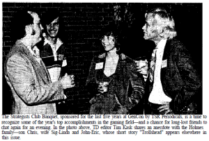 Bonus – Later in the issue they cover the 5th annual Strategists Club Banquet and Awards, which features a picture of Tim Kask talking with the Holmes family, son Chris, wife Sig-Linda and John-Eric himself.