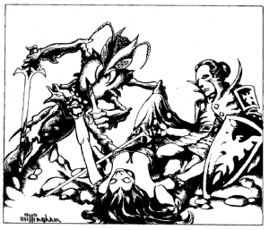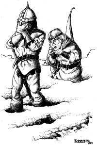 Next are “Without Any Weapons …” by Phil Meyers and then “… or with a … Weird One” by Rory Bowman. The first has new rules for pummeling in AD&D, the rules for which were never very satisfying and always overly complex. They could have been quite simple, but the gaming zeitgeist of the time was all about complexity – a far cry from the old days when the game was the thing. The later article introduces new weapons for AD&D such as atlatls, blow guns, chakrams, bullwhips, etc. I had no interest in complex fighting rules, but always liked new additions like the weapons article.